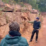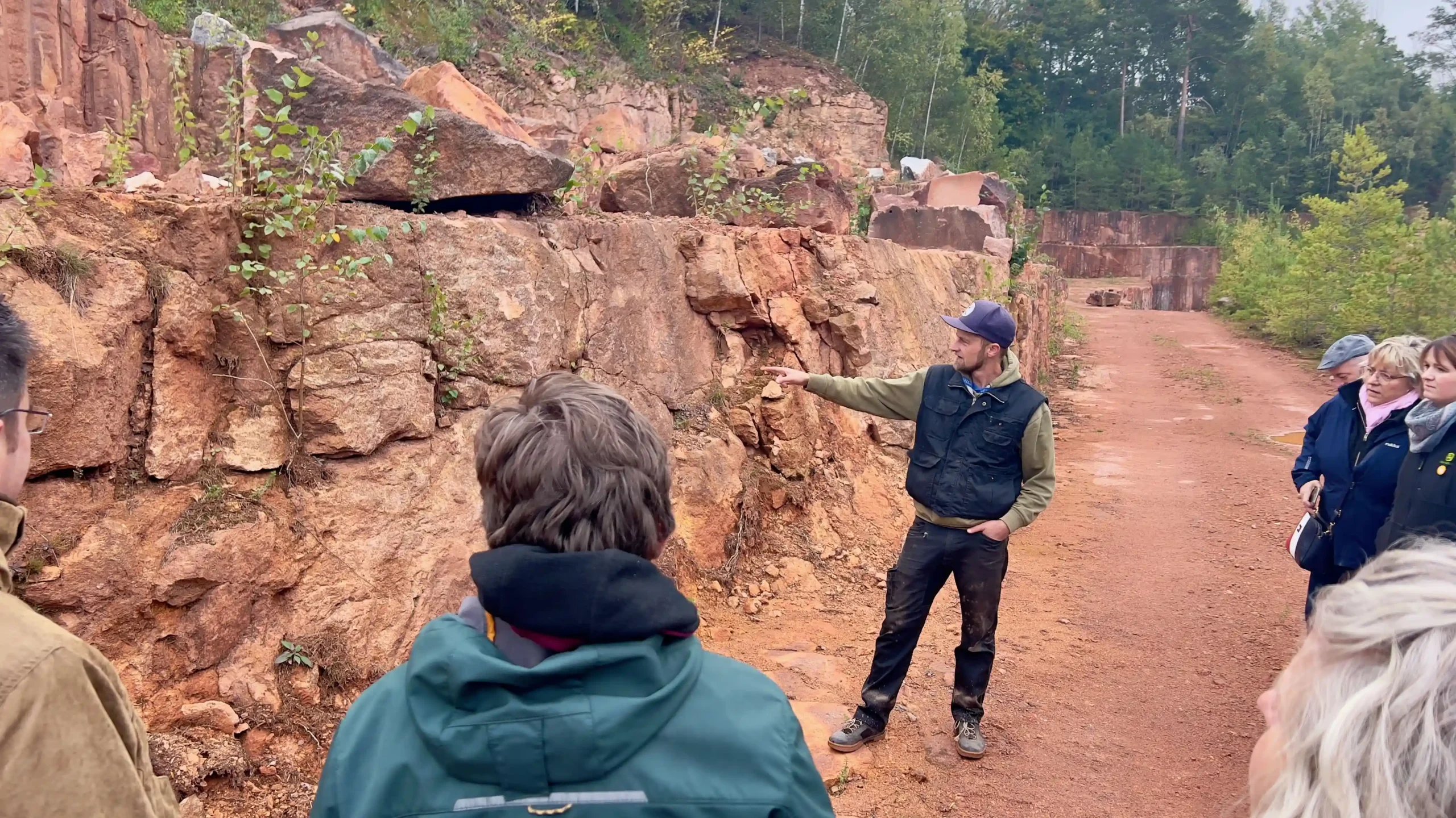 Los ging es an den Ursprüngen des Porphyrtuff im heute noch aktiven Steinbruch. Hier empfingen uns Frank Weidt und Steffen Asche von der Firma Just, die Ende letzten Jahres den Steinbruch nach der Insolvenz übernahm und aktiv weiter betreiben wird. Wir erfuhren hier aus ersten Hand welch besonderer Werkstoff hier gewonnen wird und wie sich in Zukunft durch Rückkehr zu traditionellen Abbaumethoden dem Rochlitzer Porphyrtuff neue Anwendungsgebiete eröffnen. Geduldig wurden die vielen Fragen beantwortet. Leider war die Zeit sehr kurz, denn mit dem Porphyrlehrpfad To Go stand ein weiterer Punkt auf dem Programm.